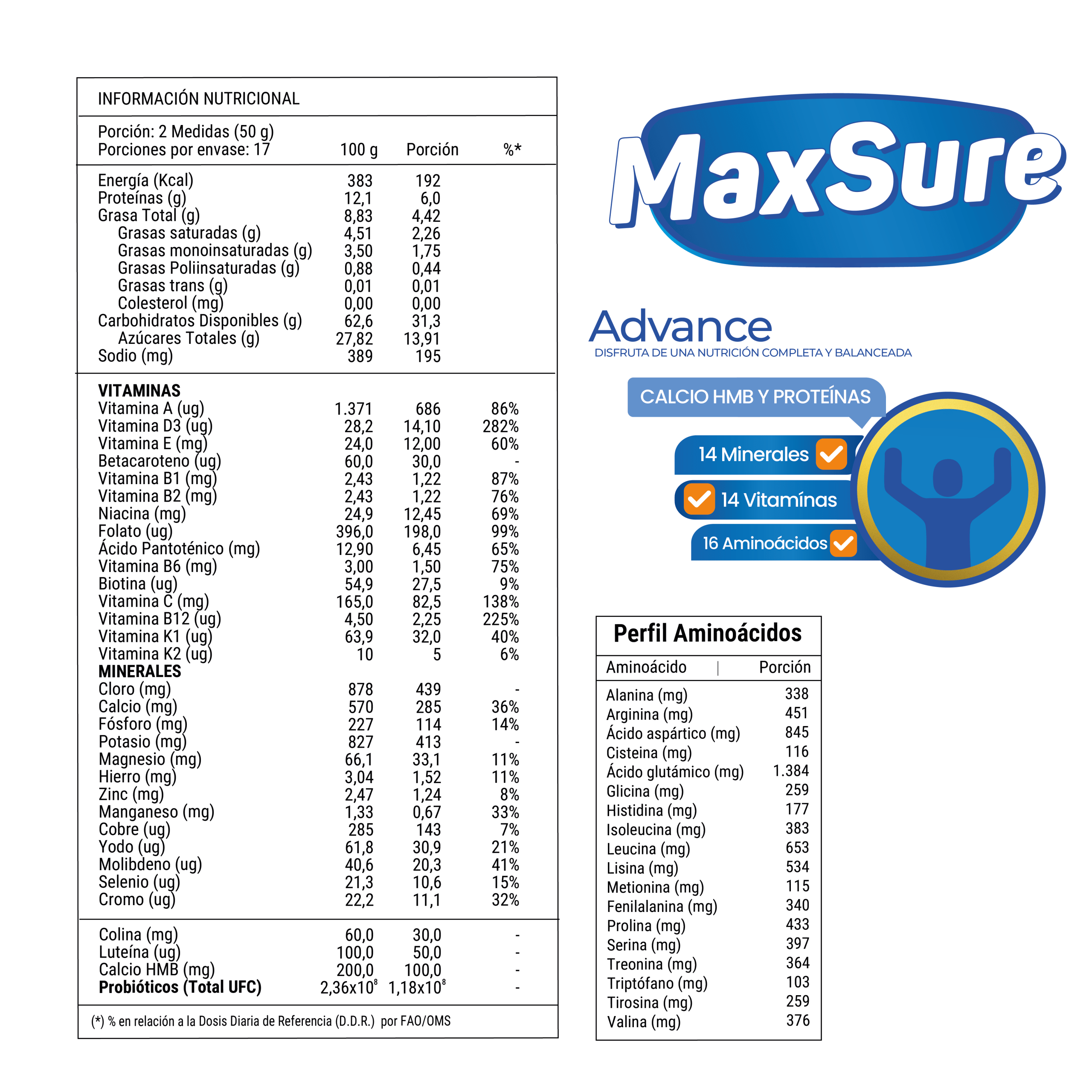 MaxSure es una fórmula en polvo de alta calidad para adultos, formulada con 50 vitaminas, minerales y aminoácidos esenciales para apoyar un estilo de vida saludable y el óptimo funcionamiento del organismo. Es ideal para la recuperación y mantenimiento de la masa muscular, especialmente en períodos de desgaste físico, envejecimiento o recuperación. Contiene calcio para huesos y músculos, HMB para la masa muscular, fibra prebiótica y probióticos para la digestión, y colina para la función cerebral, hepática y el metabolismo.